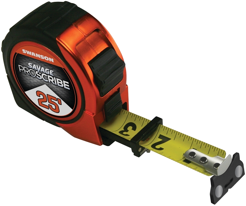 The SAVAGE™ ProScribe™ quickly transfers radius or straight lines. Edge allows for no sliver straight line scribing. Grips metal surfaces with magnetic tip. Ideal for contractors and builders. Easy-to-use blade lock hold tape in place. Nylon sleeve protective coating.