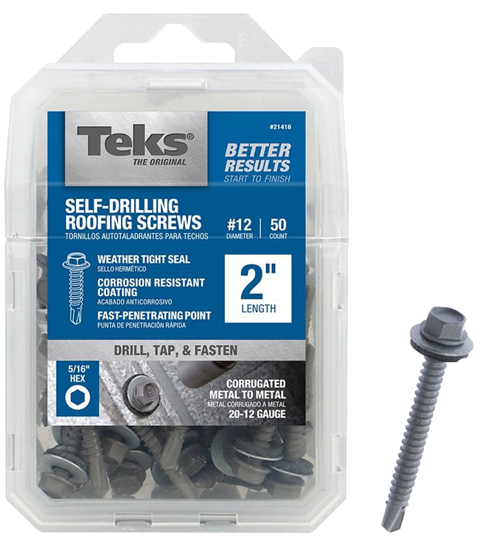 Teks 21416 Roofing Screw, #12 Thread, Coarse Thread, Hex Drive, Self-Drilling Point, Steel, Zinc, 50 PK