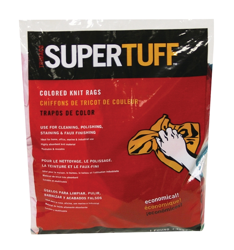 Trimaco SuperTuff pre-cut rag colored t-shirt knit rags. Absorbent and colorfast. Use throughout the home, office, marine and industry. Reusable and machine washable. Use for staining, polishing, cleaning and faux finishing.