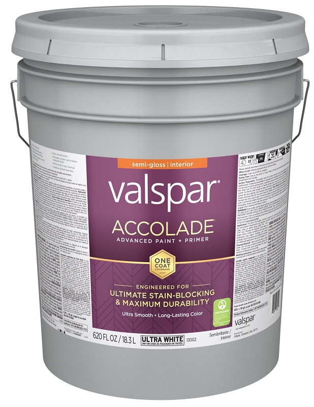 Valspar Accolade 1300 028.0013002.008 Latex Paint, Acrylic Base, Semi-Gloss, Ultra White, 5 gal, Plastic Pail