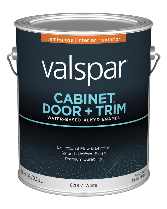 Valspar 8200 028.0082007.007 Cabinet, Door and Trim Paint Enamel, Water Base, Semi-Gloss Sheen, White Base, 1 gal