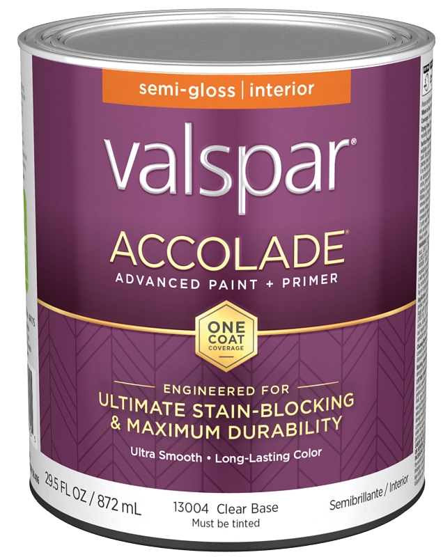 Valspar Accolade 1300 028.0013004.005 Latex Paint, Acrylic Base, Semi-Gloss, Clear Base, 1 qt, Plastic Can