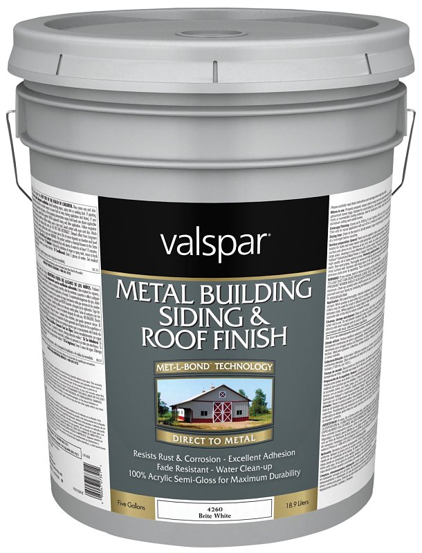 Valspar® metal building roof and siding finish restores old, weathered metal siding and roofs to a beautiful appearance and protects against rust. This premium water reducible acrylic formula dries quickly to a long-lasting, durable, fade- and chalk-resistant semi-gloss finish. Cleans up easily with soap and water. Ideal for sloped metal roofs and vertical metal siding on sheds, outbuildings, barns and pole buildings. Use as is for a “Direct to Metal” (DTM) product or use with Valspar® rusty metal primer over corroded metals.