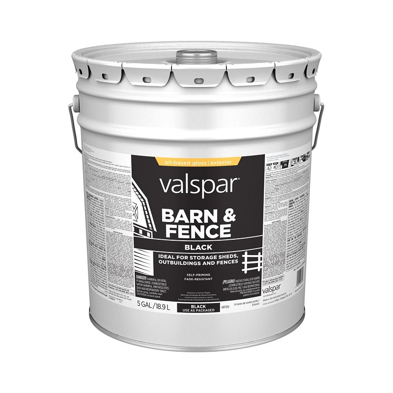 Valspar Exterior Paint, Base Type: Oil, Sheen: Gloss, Black, Net Content: 5 gal, 400 sq-ft/gal Coverage Area, Resists: Fade, Weather, Application Method: Brush, Roller, Spray, Applicable Materials: Aluminum, Metal, Wood, Drying Time: 8 hr, Compositions: Light Aliphatic Hydrocarbon, Kaolin, Calcium Carbonate, Light Aliphatic Hydrocarbon, Carbon Black, Light Aromatic Hydrocarbons, Hydrotreated Heavy Petroleum Naphtha, Zirconium 2-Ethylhexanoate, Trimethylbenzene, Methyl Ethyl Ketoxime, Manganese 2-Ethylhexanoate, 1,3,5-Trimethylbenzene, Stoddard Solvent, Specific Gravity: 0.99, Flash Point: 102.2 deg F, VOC Content: <380 g/L, pH Range: 7, Viscosity: <20.5 cSt, Vehicle Type: Alkyd Resin, Boiling Point: 212 deg F, Application Temperature: 50 to 90 deg F, Flammability Rating: 2