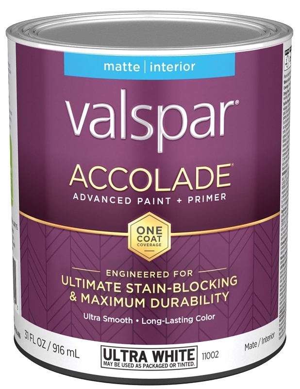 Valspar Accolade 1100 028.0011002.005 Latex Paint, Acrylic Base, Matte, Ultra White, 1 qt, Plastic Can