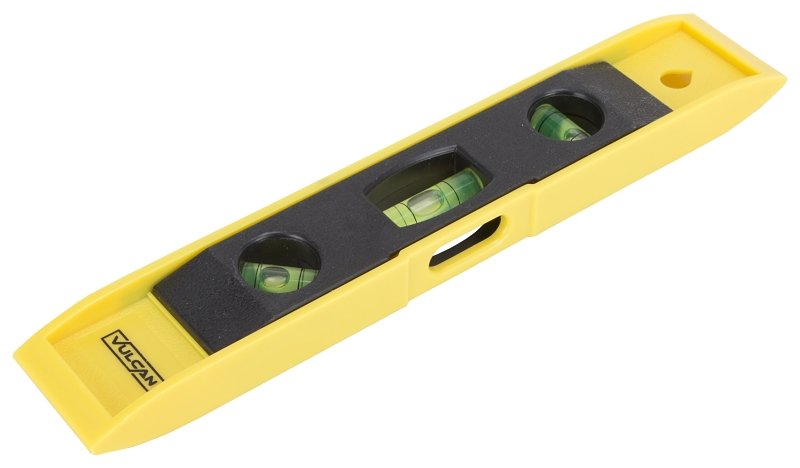 Vulcan Torpedo Level, Number of Vials: 3, Vial Material: Solvent Oil, Vial Positions: 0, 45, 90 deg, Accuracy: 1 mm/m, Number of Hang Holes: 1, Number of Measuring Surfaces: 0, Magnetic/Nonmagnetic: Magnetic, Plastic, Yellow, 9 in L, 1-1/2 in W, 5/8 in H