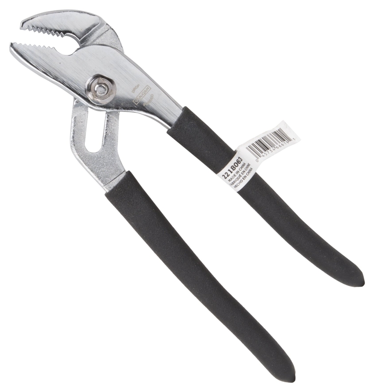 Groove joint pliers are made from steel and feature straight jaw and non-slip handles, 8 in OAL. Chrome-plated finish.