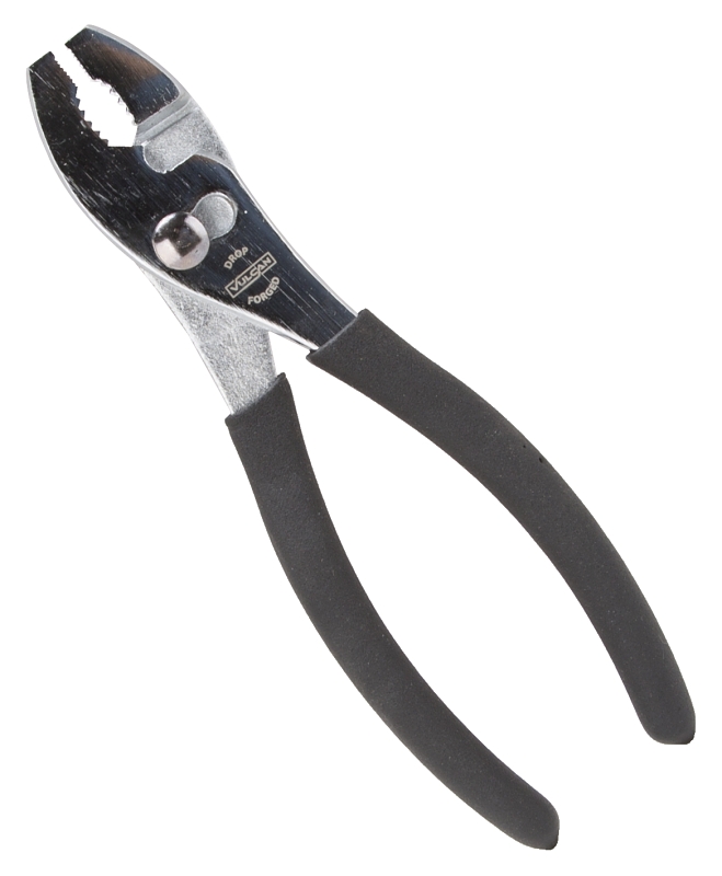 The Vulcan slip joint plier jaw material is made from carbon steel with a chrome-plated jaw finish. The handle color is black. Overall length is 8 in.