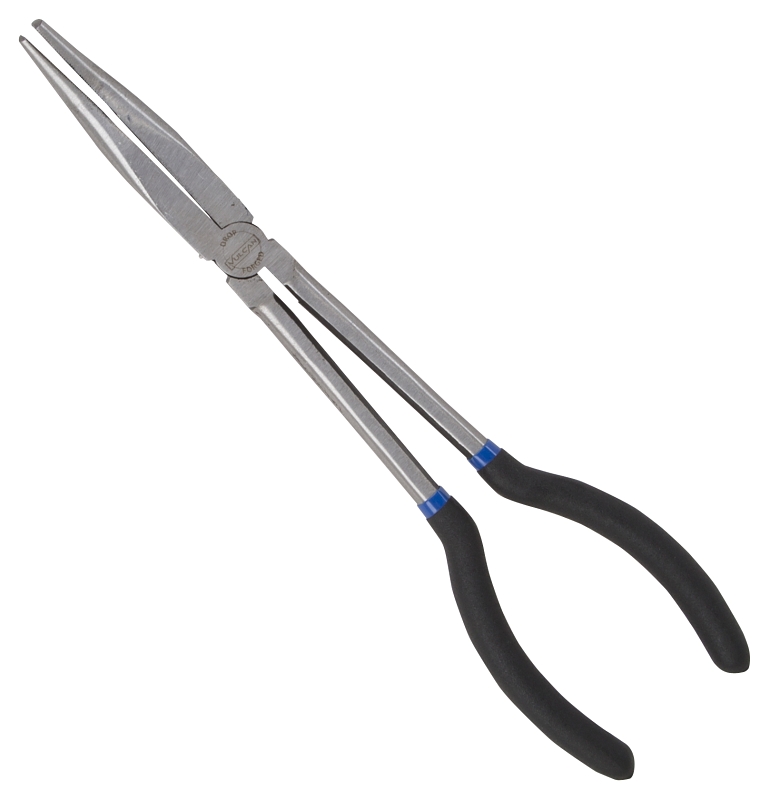 Bent nose pliers, 15 deg and 11 in long. Tapered jaws for working in tight areas.