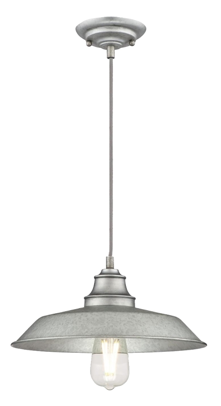 The authentic, industrial design of the Iron Hill one-light pendant is ideal for a multitude of interior styles, from modern living spaces to farmhouse kitchens. Vintage-style shade finished in galvanized steel with braided cord adds distinctive light and character to any space. This versatile pendant light includes an adjustable cord for easy adaptability in rooms with low or high ceilings. Featuring a casual look, the Iron Hill one-light pendant will provide excellent illumination for task, ambient and accent lighting. Add matching fixtures from the Iron Hill collection throughout your home as beautiful accents and for design continuity. Since the bulb is central to the design, we recommend our Timeless bulb in ST20 shape for a retro-style look. For the filament look with the energy-saving benefits of LED technology, try our filament LED ST20 bulb.