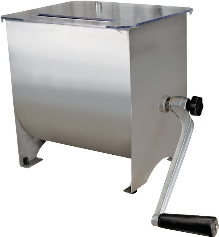 Pro Series stainless steel meat mixer. Easily mix meat and seasoning to make sausage or jerky. Great for all meats including game. Removable stainless steel mixing paddles. Rubber feet to prevent slipping. Sturdy aluminum crank handle. Clear plastic cover with convenient spice slot.