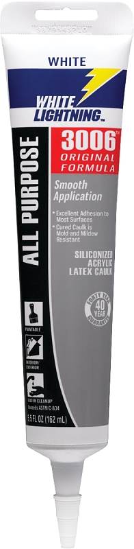 White Lightning® 3006™ is a siliconized acrylic latex caulk ideal for most general-purpose jobs. It has been a professional favorite for years. 3006™ is available in a variety of colors, including white and clear.