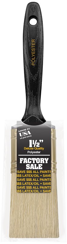 For all latex and oil paints. Gold polyester chisel trim bristle. Brass-plated steel ferrule. Black solid plastic handle.