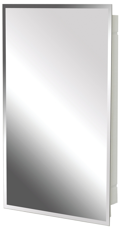 Plastic body with 2 adjustable clear shelves, beveled mirror, right or left door opening, magnet closure mechanism. Assembled dimensions of 26 in H x 16 in W x 4-1/2 in D. Rough wall opening of 23 in H x 13 in W. Body dimensions of 25 in H x 15 in W x 4-1/4 in D. Recess depth of 3-1/2 in.