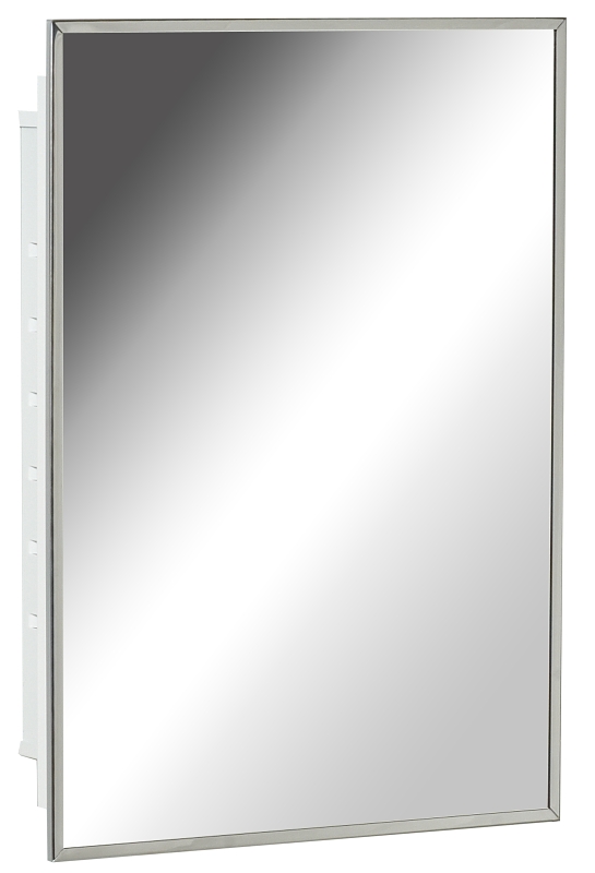 White metal frame, stainless steel body, two adjustable clear plastic shelves, left or right door opening, magnet closure mechanism, fully assembled. Assembled dimensions of 22-1/8 in H x 16-5/16 in W x 4-1/2 in D. Rough wall opening of 17-1/2 in H x 13-1/4 in W. Body dimensions of 19-1/2 in H x 15-1/4 in W x 4-1/4 in D. Recess depth of 3-1/2 in.