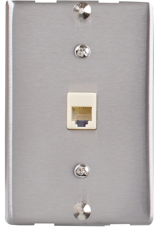 The Zenith universal wall phone jack with silver finish is for surface mounting to a standard outlet box. The silver trim adds an industrial and modern decor.
