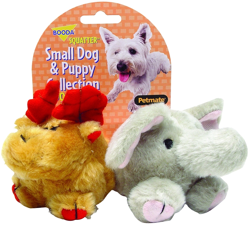 booda® small dog and puppy squatters® are adorable, pint-sized, ball-shaped plush toys with lots of personality. Soft for your dog to bite, yet durable and tough enough for a game of fetch. Drive your dog wild with these adorable characters, including moose, elephant, panda, rabbit, hedgehog or raccoon, featuring a fun squeaker. Sized ideally for small dogs and puppies.